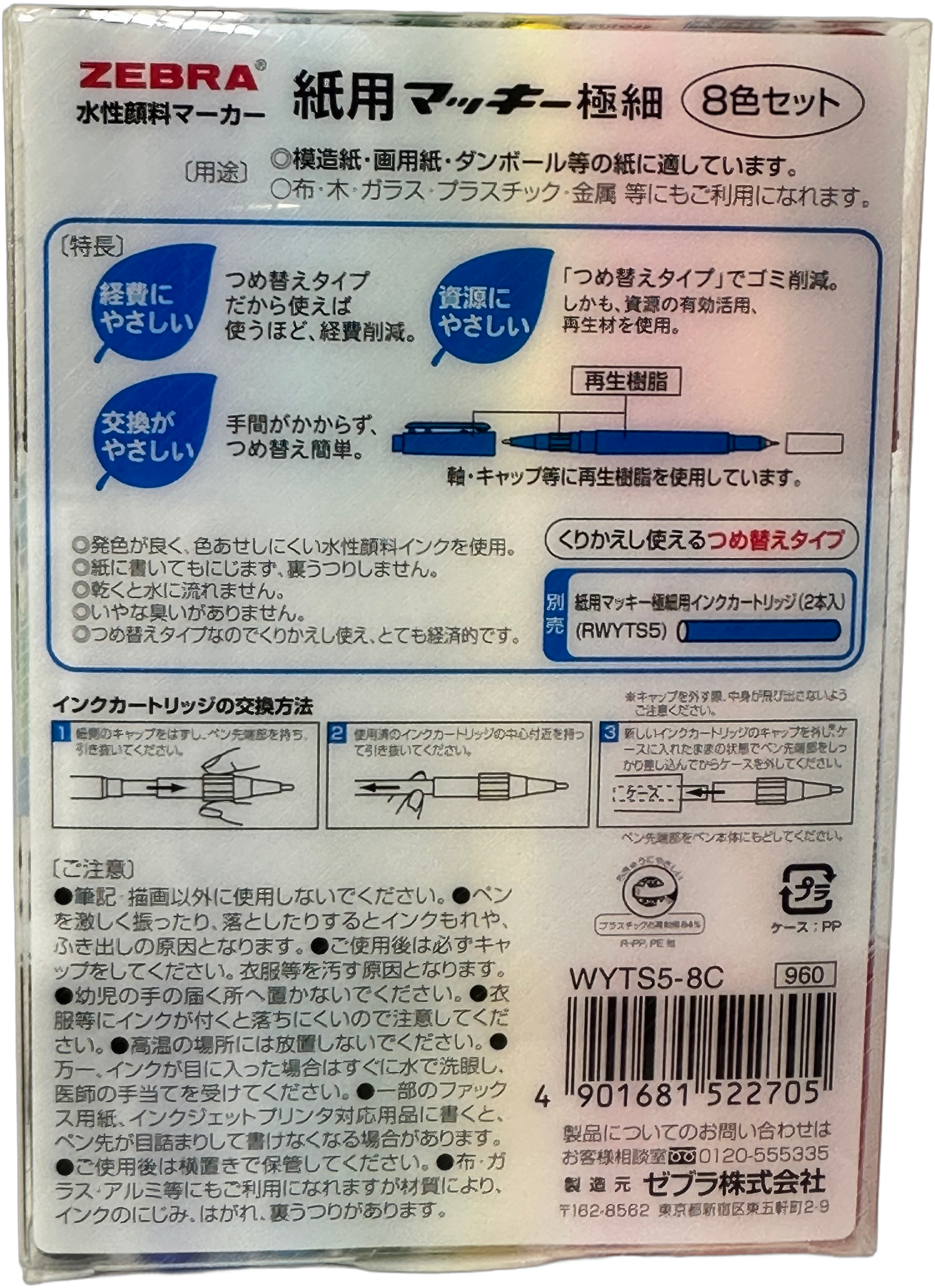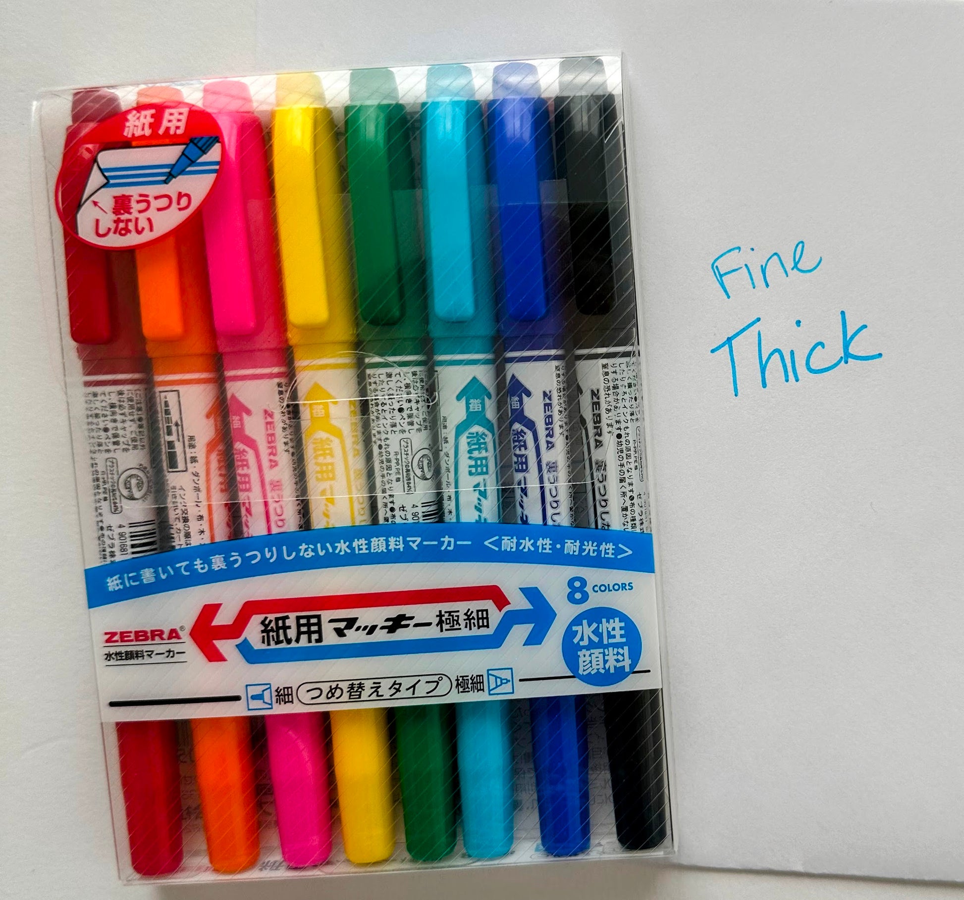 Unleash your inner artist with these Zebra Paper Markers! This vibrant set of 8 colors is ready to bring your paper crafts to life. On one side they're so fine-tipped (0.5mm), they'll let you doodle details that would make a hummingbird jealous, while on the other the thicker end is perfect for filling in larger spaces (07.-1.2mm line width). Plus, they're like magic – they won't bleed through your precious pages! Can also be used on cloth, wood, glass, plastic, etc.